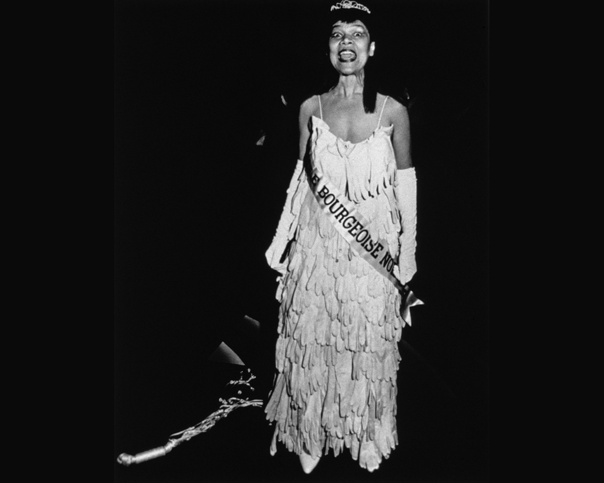 O ' grady构思的形象:一个虚构的选美皇后赢得了“标题”的“Mlle 1955中产阶级的女人讨厌的人。”(黑人中产阶级小姐)。她的服装由一个礼服和一个角的180双白色的手套,腰带和皇冠。晚开,O’grady穿上她的角色的服装和坠毁。她的表演包括鞭打自己九尾猫和喊着一首诗最后一行“黑人艺术必须承担更大的风险! ! !”